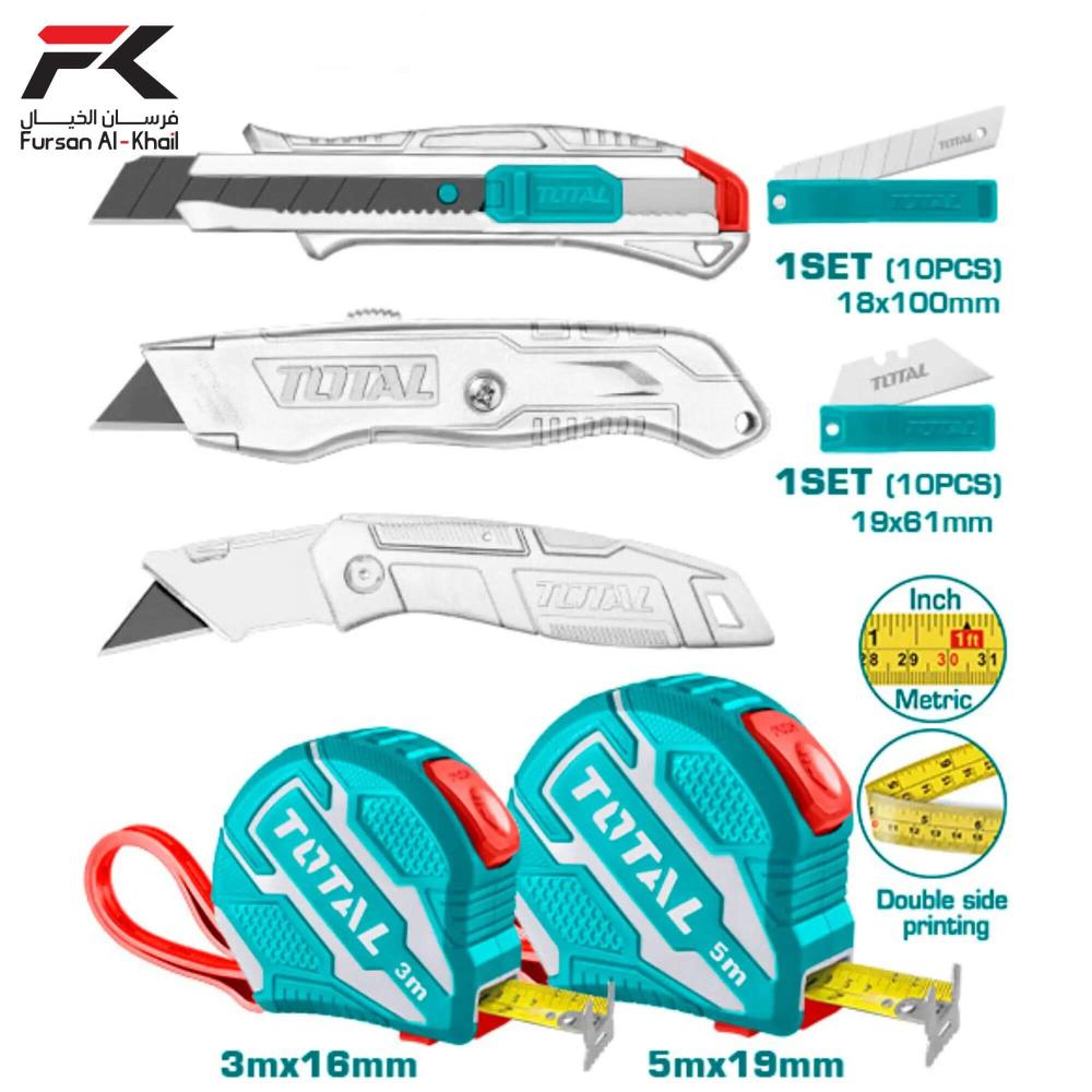 مجموعة أدوات احترافية من TOTAL تتكون من 7 قطع أساسية لتلبية احتياجاتك اليومية في القص والقياس. تأتي المجموعة بتصميم عالي الجودة يشمل مشارط قابلة للطي، وشفرات احتياطية، وأشرطة قياس فولاذية بطبعة مزدوجة (إنش ومتر). مثالية للحرفيين، النجّارين، الفنيين أو للاستخدام المنزلي.