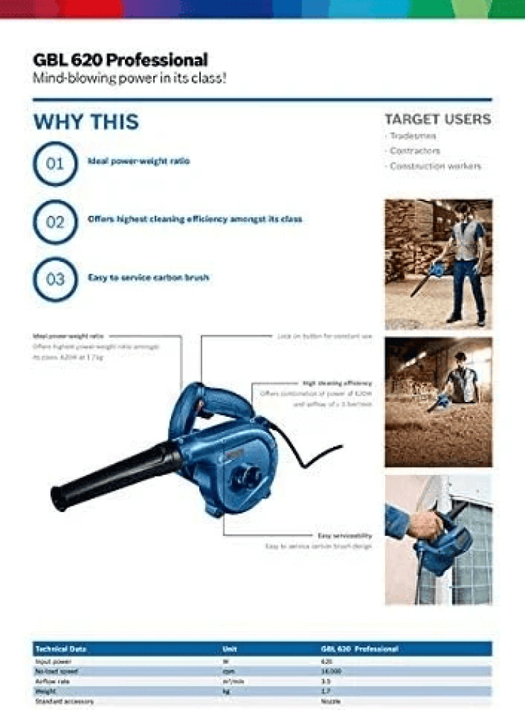 استعد لتجربة تنظيف فعالة مع منفاخ الهواء 620 واط من بوش. يتميز بقوة مذهلة في فئته ونسبة قوة إلى وزن مثالية، مما يوفر أعلى كفاءة تنظيف. يأتي مع فرشاة كربون سهلة الصيانة لمزيد من الراحة.